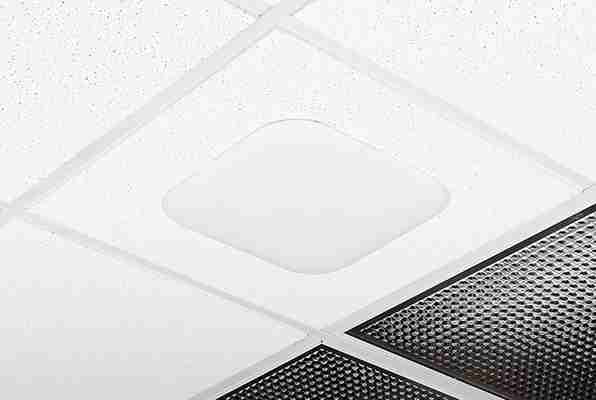 Oberon® In-Plane™ Recessed Mounts 1440 are an economical cloud/canopy/suspended ceiling mounting kit for most vendors’ access points and antennas. A cutout is made in the ceiling panel, the panel bridge is placed above the ceiling panel, and the access point is attached to the white trim. The access point and trim assembly is then drawn into the panel bridge with a torsion spring, much like a recessed lighting fixture, with only the front face exposed for optimal wireless coverage. When the AP brand or model changes, the AP trim is easily swapped for new trim.